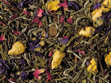 Een elegante, groen en witte thee. Exquise groene en witte theeën in verschillende vormen en maten zullen uw ogen en uw zintuigen verrukken. Diepgroene, grote zilverbruine en donzige wit getipte theebladeren worden vergezeld door gele rozenknoppen, rode rozenblaadjes en lila kaasjeskruidbloemen om een zachte maar overheersende groene thee te creëren. Het aromatische boeket samengesteld uit exotisch fruit, met lichte, pittige, frisse Citrus nuances en een vleugje delicate, bloemige jasmijn belooft een heel bijzonder genot…