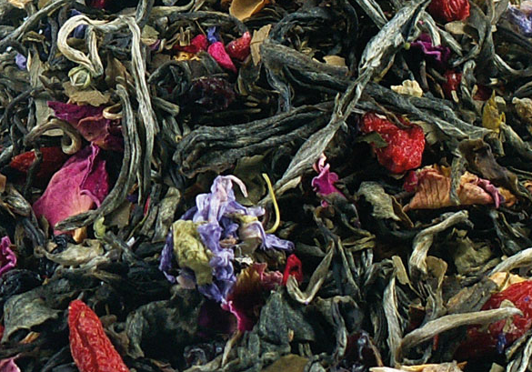 Witte thee, geoliede aalbessen (aalbessen, zonnebloemolie), gojibessen, zoete bramenblaadjes, curaçao-peulen, rode rozenblaadjes, aroma, robinia-bloesems, granaatappelbloesems, frambozenstukjes (1,85%) en blauwe aromabloesems.