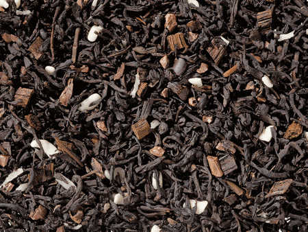 zwarte thee 80%, cacaonibs, aroma, witte chocoladeschilfers, vanillestukjes, gedroogde kokosnoot